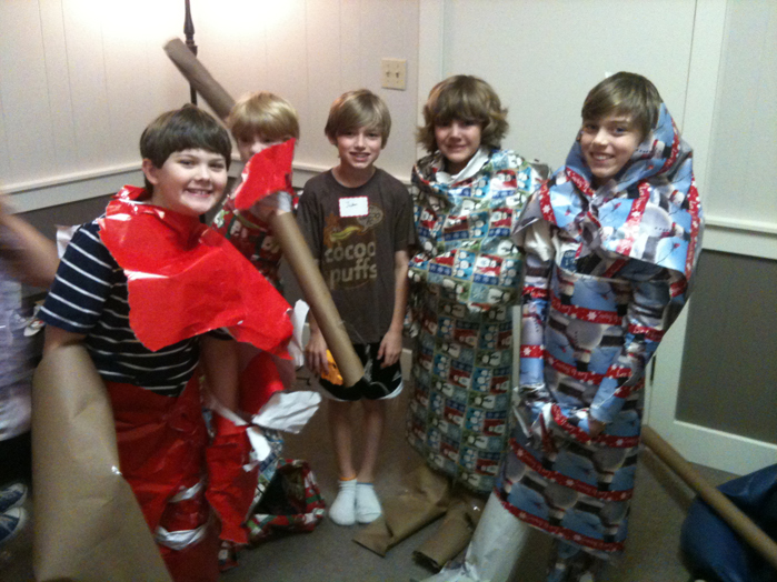 This Sunday at Pursuit, our preteen ministry, we played the Christmas Wrap game. It’s a simple game. Pair preteen with a partner and have one student wrap the other in Christmas wrapping paper. The team that is most creative wins. Here’s a pic of our group. Fun game!